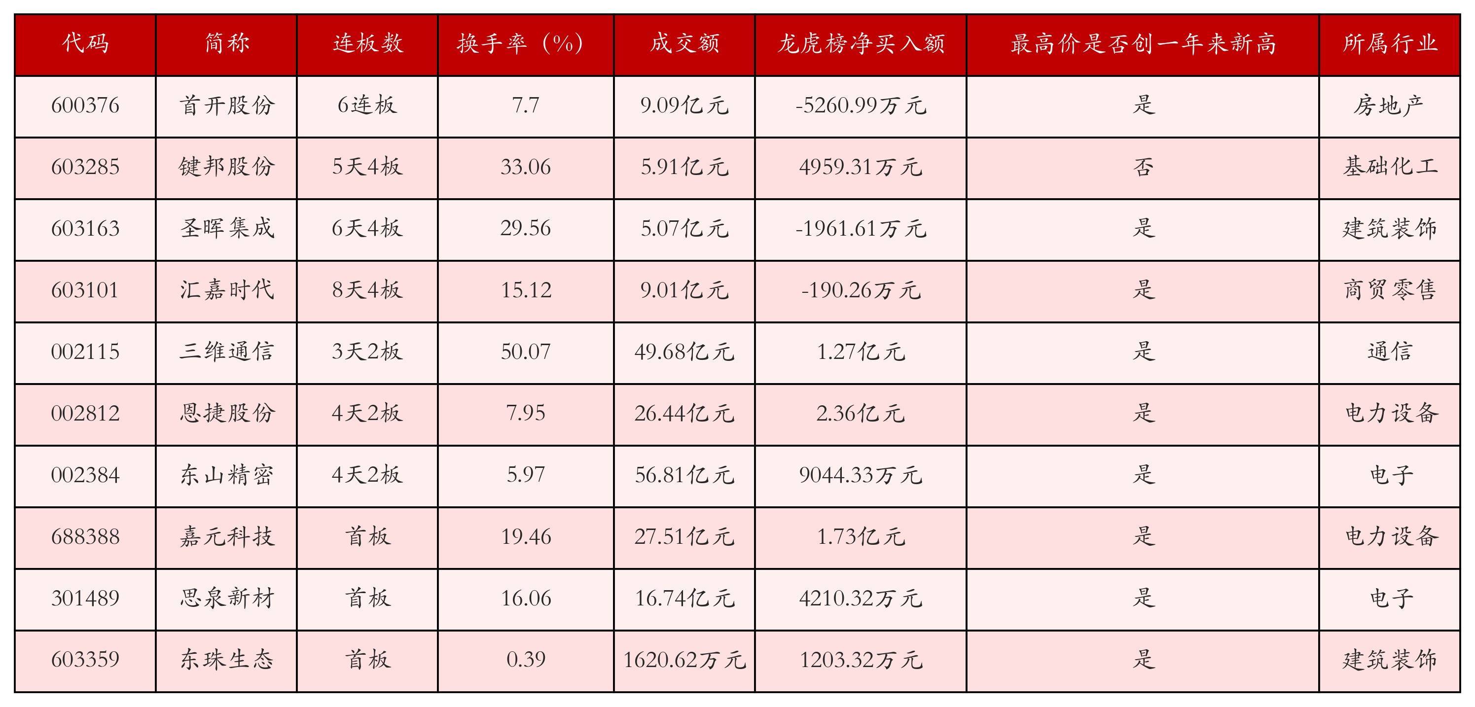 截至9月10日收盘,上证综指上涨0.13%,收于3812.22点,深证成指上涨0.38%,收于12557.68点,创业板指上涨1.27%,收于2904.27点。今日沪深两市A股共计65只涨停,综合当前连板数以及当日龙虎榜数据,其中较为强势的前三只个股分别为:首开股份(600376)、键邦股份(603285)与圣晖集成(603163)。今日强势个股前10位具体数据见下表: