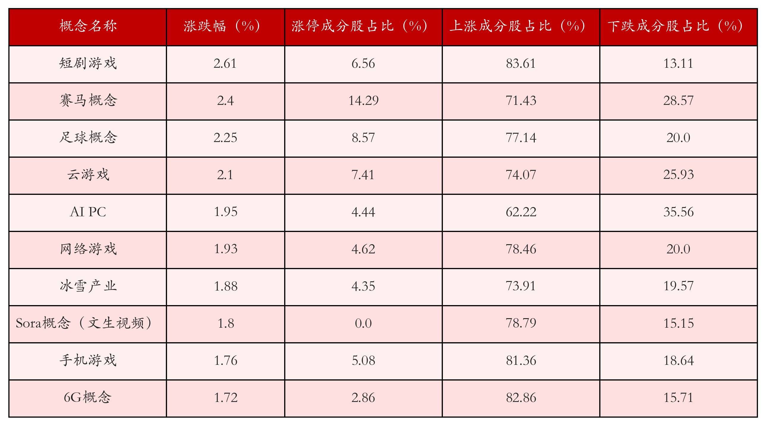 根据A股概念涨跌幅与所对应的股票池综合分析,涨幅靠前的三个概念板块分别为:短剧游戏、赛马概念与足球概念。排名前10位的概念板块相关数据见下表: